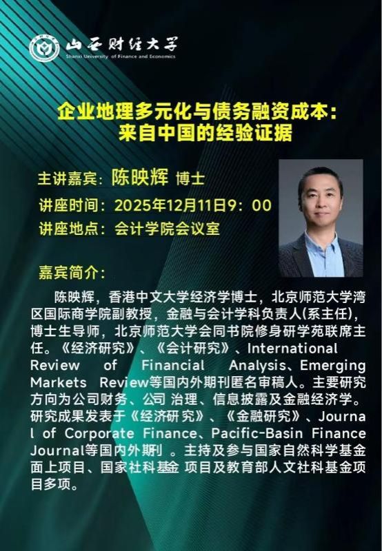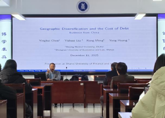 相关领导、教师及硕博研究生现场聆听,报告由孙凡教授主持。报告中,陈映辉教授首先介绍了该研究的动机,系统梳理了相关领域的研究文献脉络。随后,围绕研究的核心逻辑展开分享,详细介绍了实证研究部分,包括数据样本、描述性统计、基准回归模型等内容,展示了地理多元化推高企业债务融资成本的核心实证结果,并从外部摩擦、内部摩擦等角度验证机制,结合距离、分析师覆盖度等因素分析异质性,通过稳健性与识别检验确保结论可靠。最后,现场师生踊跃提问,与陈映辉教授展开深入探讨,孙凡教授对报告进行总结,高度评价了研究的学术价值与实践启示。