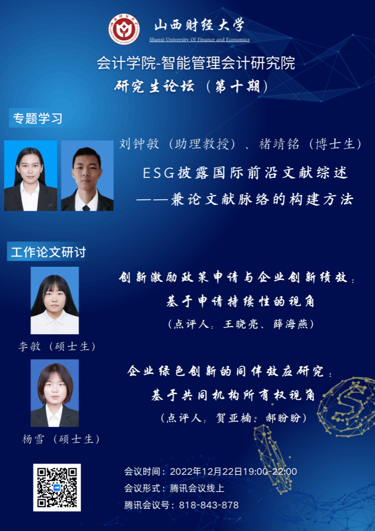与智能管理会计研究院联合举办的研究生论坛第十期以线上会议的形式举行。会议由李颖老师主持。参会人数八十余人。本次学术沙龙活动主要包括专题学习与工作论文研讨两方面内容。