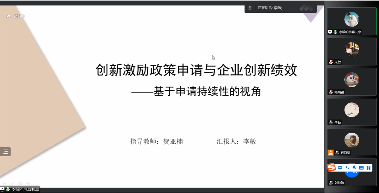 在工作论文研讨环节,李敏硕士首先汇报了工作论文《创新激励政策申请与企业创新绩效——基于申请持续性的视角》。之后,王晓亮与薛海燕两位老师进行点评。王晓亮老师认为:总体上文章选题的时间维度具有创新性,具有实践价值,研究内容较为丰富,实证分析也比较规范;但是文章题目的表述不够清晰,建议清晰地界定研究主题;文献综述应该从研究重点分专题进行梳理,文中并没有分专题;理论分析与研究假设部分、异质性分析部分缺乏一定的理论依据;中介作用分析部分代理变量的选取不合适,将发明专利进行0、1变量分组值得考量;本文的样本量选择有偏,影响研究结论。薛海燕老师指出:文章的应用价值、研究结论的意义不够重大;在样本选择期间,政策存在变动,会影响研究结论;对申请持续性没有清晰界定,变量设定不合理;申请动机如何衡量?建议对申请动机进行进一步研究。