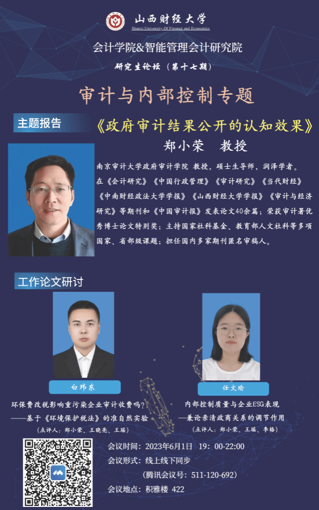 与智能管理会计研究院联合举办了研究生论坛(第十七期)。本次论坛的主题为“审计与内部控制专题”,采取线下与线上同步的方式。轮值主持人为皇冠体育