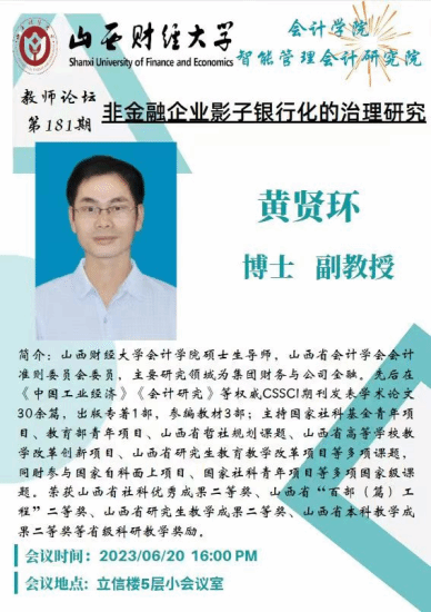 与智能管理会计研究院联合举行了第181次教师论坛。本次论坛由智能管理会计研究院副院长李颖教授主持,主要内容为黄贤环老师作主题报告《非金融企业银子银行化的治理研究》。