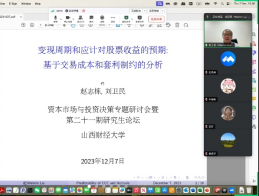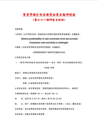 与智能管理会计研究院联合举办的研究生论坛(第二十一期)以线下线上两种方式同步举行。本次学术论坛的主题为“资本市场分析与投资决策”,轮值主持人为智能与管理会计教研室主任贺亚楠副教授,论坛特别邀请北京师范大学—香港浸会大学联合国际皇冠体育