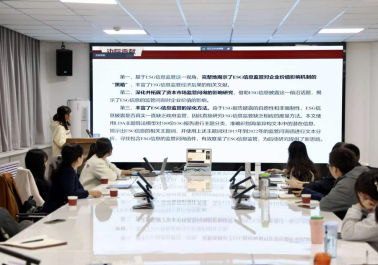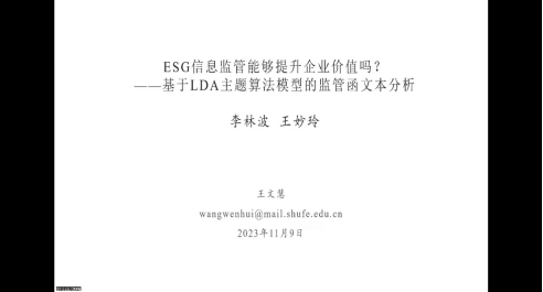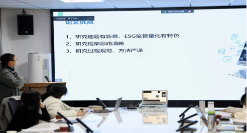 硕士研究生王妙玲汇报了自己的论文,题目为《ESG信息监管能够提升企业价值吗?——基于LDA主题算法模型的监管函文本分析》。