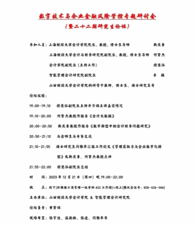 与智能管理会计研究院联合举办的研究生论坛(第二十二期)以线下和线上两种方式同步进行。本次学术论坛的主题为“数字技术与企业金融风险管控”,主持人为皇冠体育