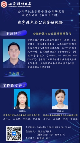 研究生论坛(第二十六期)成功举办。本次论坛的主题为“数字技术与公司金融风险”,采取线上和线下两种方式同步进行。论坛特别邀请江西财经大学财经数据科学重点实验室副主任、金融学博士生导师王红建教授做主题报告。王红建教授入选2022年财政部高层次财会人才素质提升工程、2019年江西省双千计划,在《经济研究》《管理世界》《管理科学学报》《Journal of Banking and Finance》《中国工业经济》等权威期刊发表论文30余篇,主持国家级和省部级项目各3项,获省部级以上奖项4项。