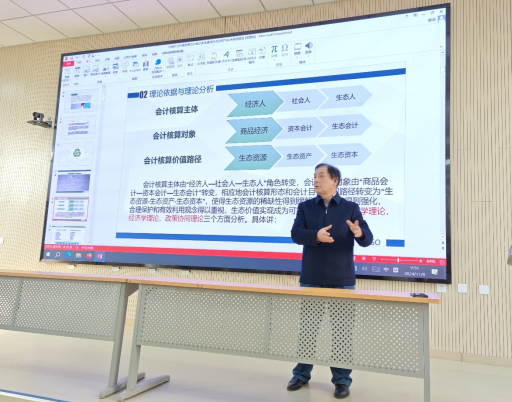 骨干教师、硕士及博士生做专题报告。环境资源会计作为会计学的一个重要分支,专注于记录、分析和报告与环境资源相关的财务活动,涵盖了自然资源的财务价值评估及环境资源的合理利用、管理、控制及保护等方面的会计活动。环境会计是以经济可持续发展战略目标为指导,运用会计学的基本理论与方法,对企业和其他组织对环境产生影响的经济活动进行核算与监督,为企业内部决策提供信息支持的一种管理信息系统。袁教授介绍了会计核算主体、对象和价值路径的转变,强调了会计核算中经济效益、社会效益和生态效益的兼顾;影响环境履约责任的重要因素,例如皇冠体育app、经营观念、战略规划等。袁教授介绍了资源环境会计研究的目标宗旨、逻辑主线及研究前景,强调了深化生态文明思想、构建具有中国特色的环境资源会计体系的重要性。他指出未来研究将聚焦于构建中国化环境会计理论体系、制定环境会计指南、探索生态补偿价值实现机制等战略目标。在成本控制和信息披露方面,袁教授详细讲解了环境完全成本指标、环境大收入指标、环保专用基金指标和环境所有者权益指标等关键指标,这些指标对于企业环保策略的制定和环保活动的经济效益评估具有重要意义。