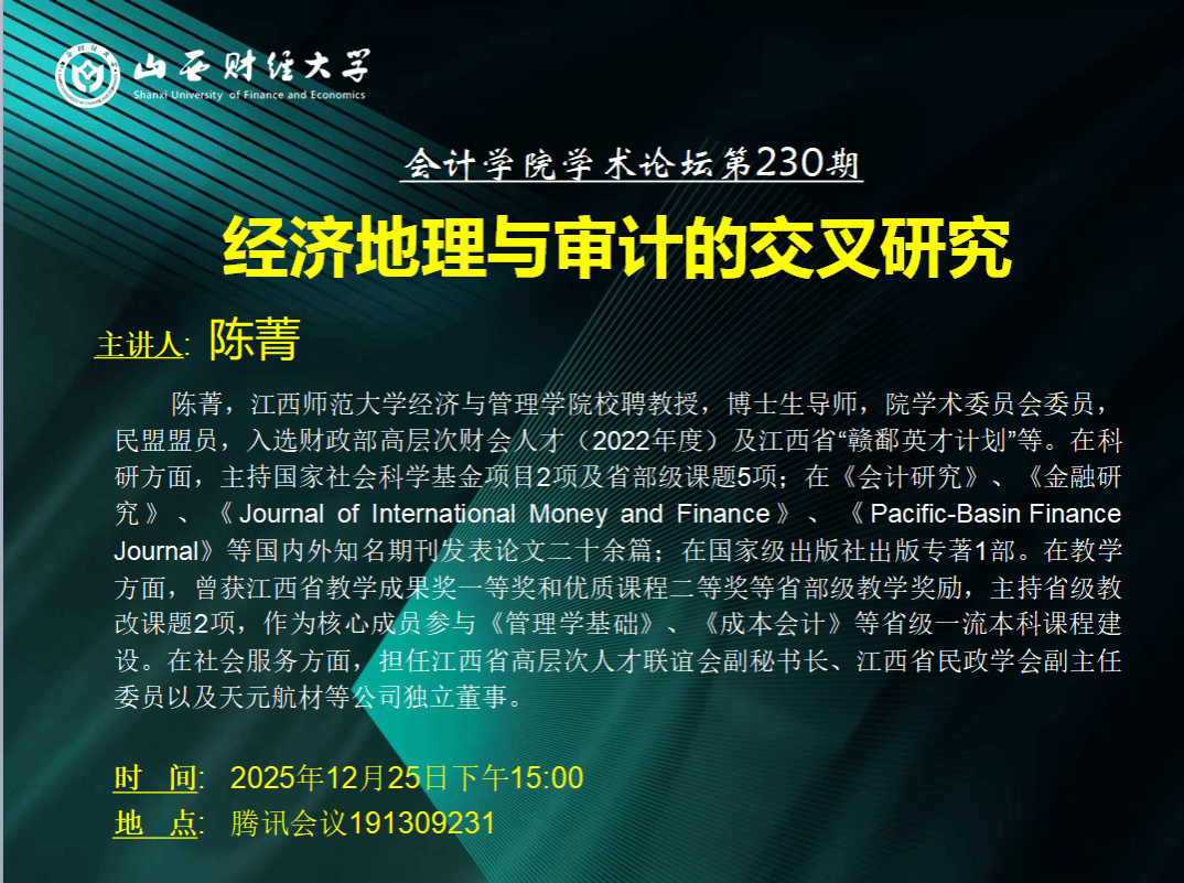 第230期学术论坛顺利举行。本期论坛聚焦“经济地理与审计的交叉研究”主题,特邀江西师范大学陈菁教授进行学术分享。论坛吸引了众多师生参与,现场学术氛围浓厚。