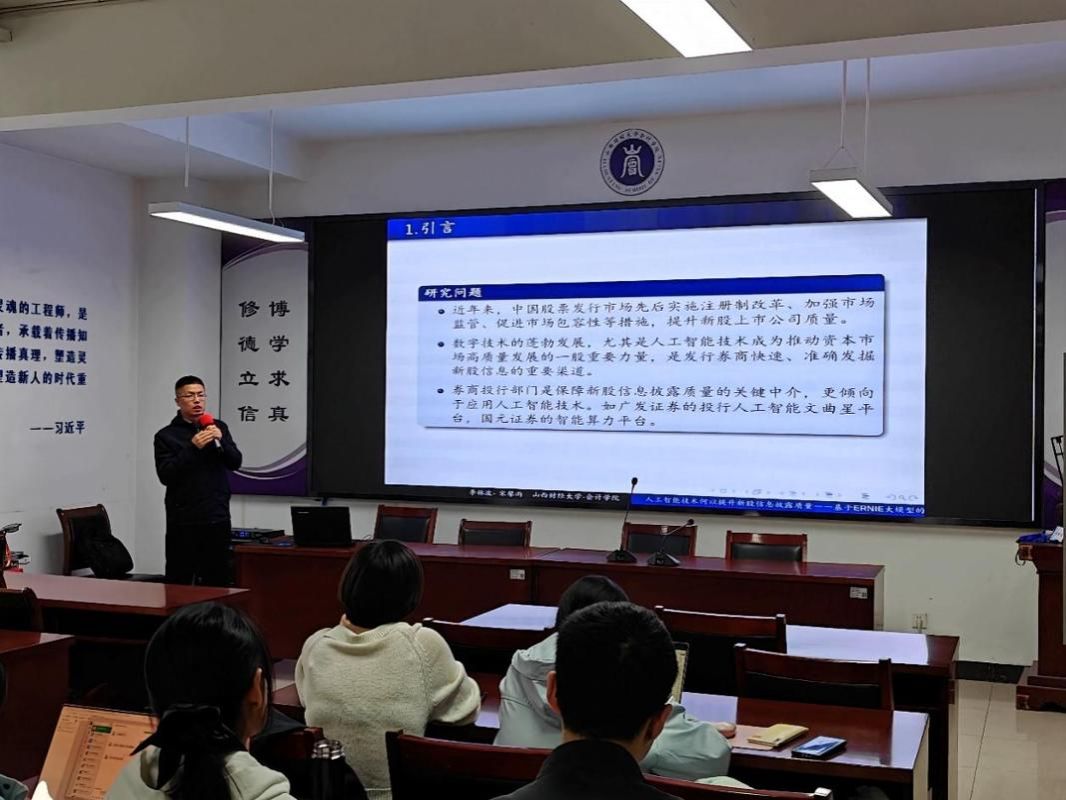 三十余位骨干教师及博士生齐聚一堂,共同参与了此次学术交流活动。论坛分为两个阶段。第一阶段,李林波老师分享了自己最新的研究成果,围绕大模型技术在信息披露中的应用,深入探讨了人工智能对新股信息披露质量可能产生的影响机制与效果。第二阶段,薛海燕老师从研究背景、理论贡献、研究假设到研究设计等多个维度,系统介绍了其近期关注的“企业气候行动的驱动机制”研究主题,重点剖析了标杆企业与追随型企业在气候行动上的内在关联与互动逻辑。在随后的交流环节中,与会教师围绕选题价值、研究框架设计、变量测度方法以及政策导向意义等关键问题展开了深入而热烈的讨论。本次论坛不仅为教师们提供了前沿会计学研究的交流平台,也使大家对人工智能、气候治理等交叉领域的最新学术动态有了更加清晰和深刻的认识。
