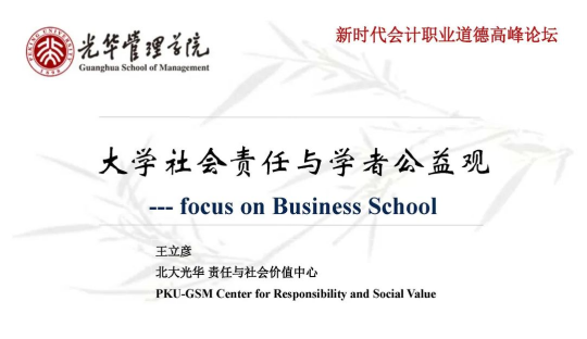 王立彦教授在西藏拉萨通过视频连线,作了题为“大学社会责任与学者公益观”的专题演讲。王教授通过将国内外大学社会责任与企业社会责任进行比较,指出在经济社会领域,企业社会责任理念已被广泛接受,并较好地落实到企业战略规划和运营中,但大学社会责任较少被谈及。他倡导“大学社会责任观”,呼吁大学应当把责任、公益和社会价值理念融入教学,认为财经学者眼中的公益应当具有专业性公益、学术性公益和慈善性公益三个方面。