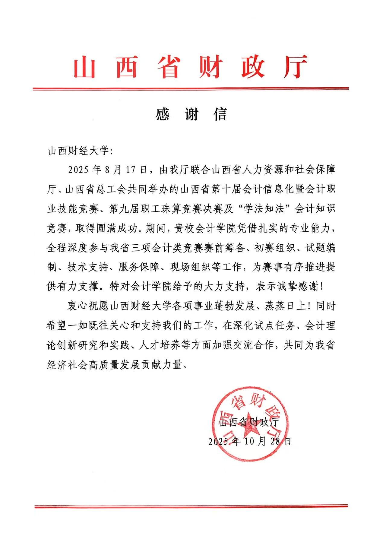 在山西省第十届会计信息化暨会计职业技能竞赛、第九届职工珠算竞赛决赛及“学法知法”会计知识竞赛三项省级重要赛事中的全方位支持与深度参与,致以诚挚谢意。信中高度肯定了皇冠体育