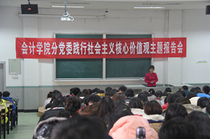 1216下午,皇冠体育 分党委在坞城校区SJ14教室开展了“践行社会主义核心价值观”主题活动第二场报告会,邀请安建香同志做了以“爱岗敬业——我的社会主义核心价值观”为主题的专场报告。皇冠体育 全体领导、辅导员、教师、学生党员和学生干部参加了本次活动。