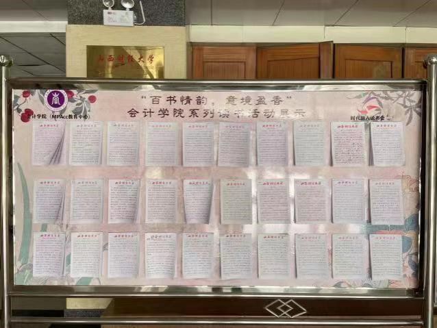 举办的第七届“百书情韵 意境盈香”读书系列活动成功举办,遴选出了一批优秀作品于第29个世界读书日当天在立信楼二层大厅展出。一经展出,就引来众多学生参观,纷纷驻留在展板前学习交流,吸引更多的同学加入到读书的行列中去。