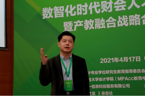 全国会计专业学位研究生教育指导委员会副主任委员兼秘书长、中国人民大学博士生导师王化成教授作了题为《数智时代的财会人才需求与教育变革》的主题报告,以蚂蚁金服的诞生为引子,阐明了数智经济的特征,我国在数字经济方面有天然的优势,并介绍了数智时代下企事业单位的智能化财务和财会岗位发生的变化,进一步提出了数智时代的财会教育变革思路。